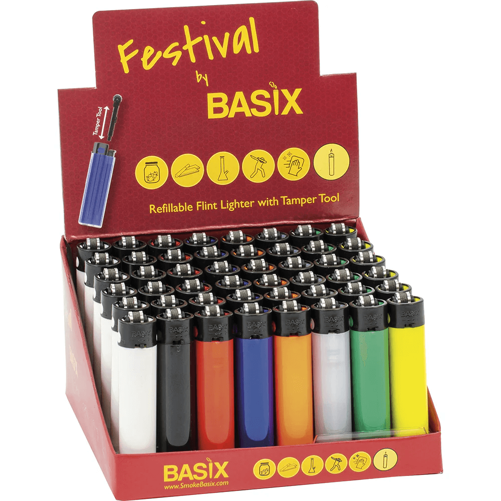 Bring color and convenience to your everyday lighting needs with the Basix 48Ct. Festival Assorted Solid Color Lighters. This bulk pack includes 48 reliable refillable lighters in vibrant solid colors—perfect for parties, festivals, convenience stores, or personal use. Each lighter delivers a steady flame for lighting candles, grills, incense, or smokes with ease. Designed for safety and durability, Basix lighters are lightweight, easy to use, and built for long-lasting performance. Ideal for retailers, event organizers, or anyone who wants dependable fire at their fingertips.