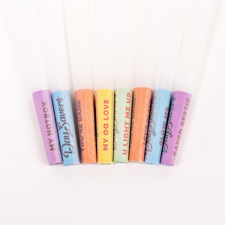 Each cone features a colorful novelty filter tip printed with sweet, lighthearted phrases inspired by classic candy heart designs. The themed tips make these cones a great choice for gifting, parties, or everyday use when you want something a little different.